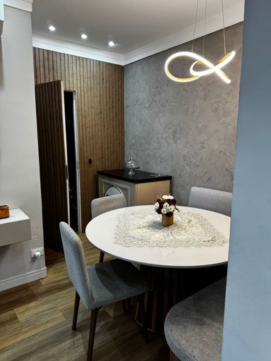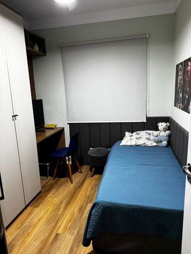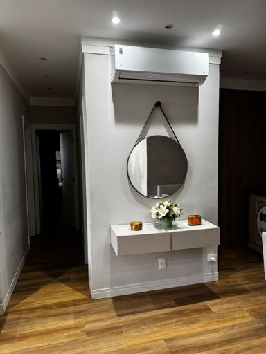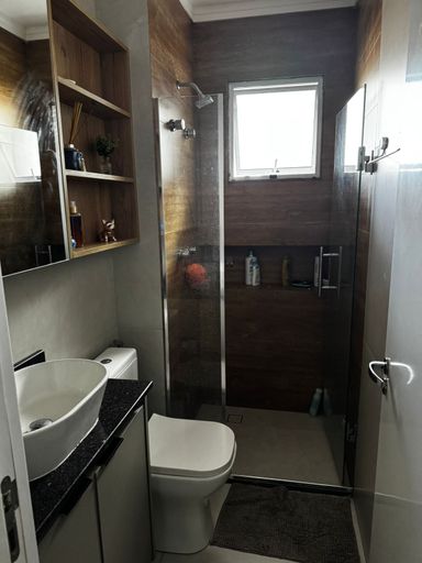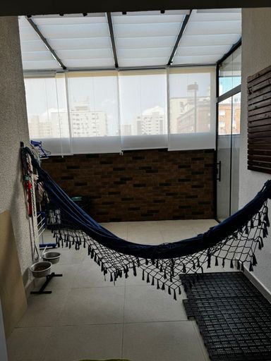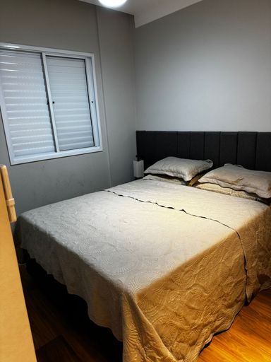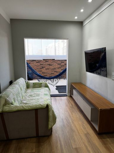 O apartamento conta com sala de estar e jantar com ar-condicionado, proporcionando conforto e integração entre os ambientes. São 2 dormitórios, sendo 1 suíte, além de banheiro social. A cozinha possui móveis planejados, garantindo funcionalidade e melhor aproveitamento do espaço, além de área de serviço independente.