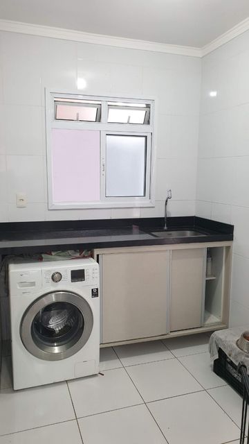 Área de serviço independente com máquina de lavar roupas e depósito/despensa.